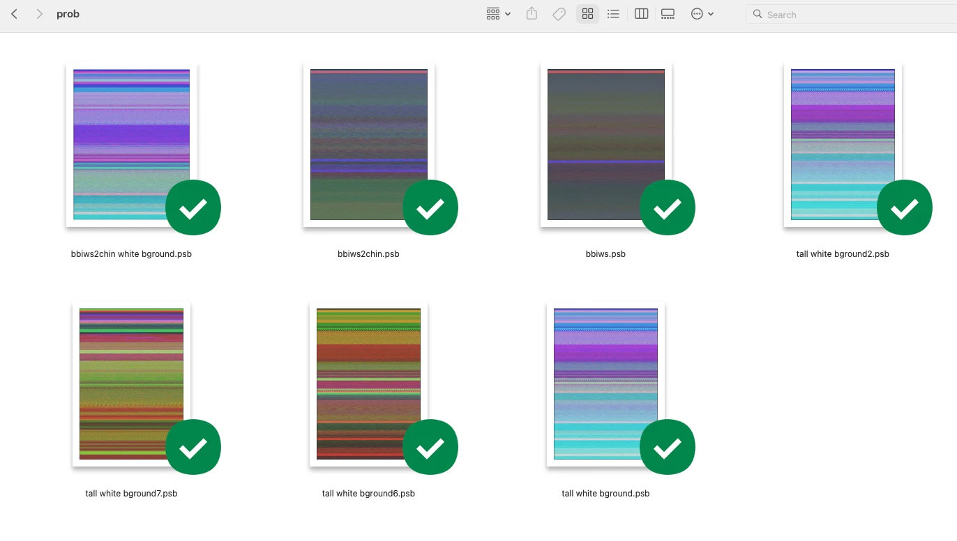 How the problem manifests: I enlarge the thumbnails in MacOS by dragging the thumbnail size slider to the right. At some point the .psb files switch to weird colorful versions while the rest (.jpg, .psd) continue to resize all the way up to the largest possible display.