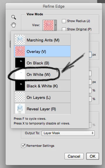 When I use Refine Edge in Photoshop CC 2014, I try to change the view using hotkeys, all keys are working (M, V, B, K, L, R, F) except for W. When I press W error sound sounds and nothing happens. Looks like there is a conflict of this key with the Mac OS X Yosemite.