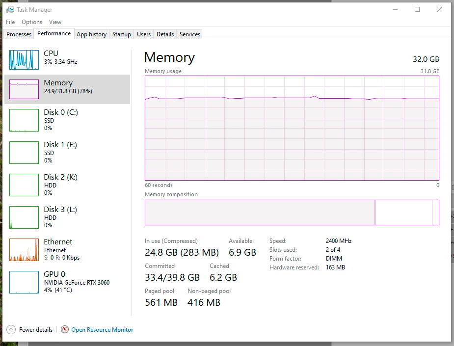 If you post Help > System Info, there might be clues there. Also, the memory graph from Task manager can be useful to see how it's used over time. Set update speed to low, which will capture 4 minutes.