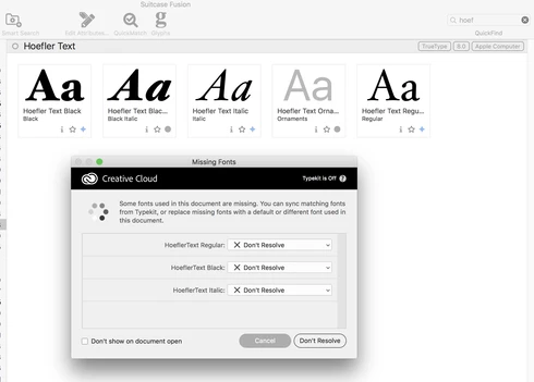 Even though fonts in Suitcase Fusion have been activated, an active TypeKit window appears. When I click CANCEL or even select an alternative font and click DON’T RESOLVE, the window won’t close. While it is active, the spinning dots just keep going and going. I have to quit or force quit Photoshop in order to use it. Then I have to manually turn on the full family and reopen Photoshop.