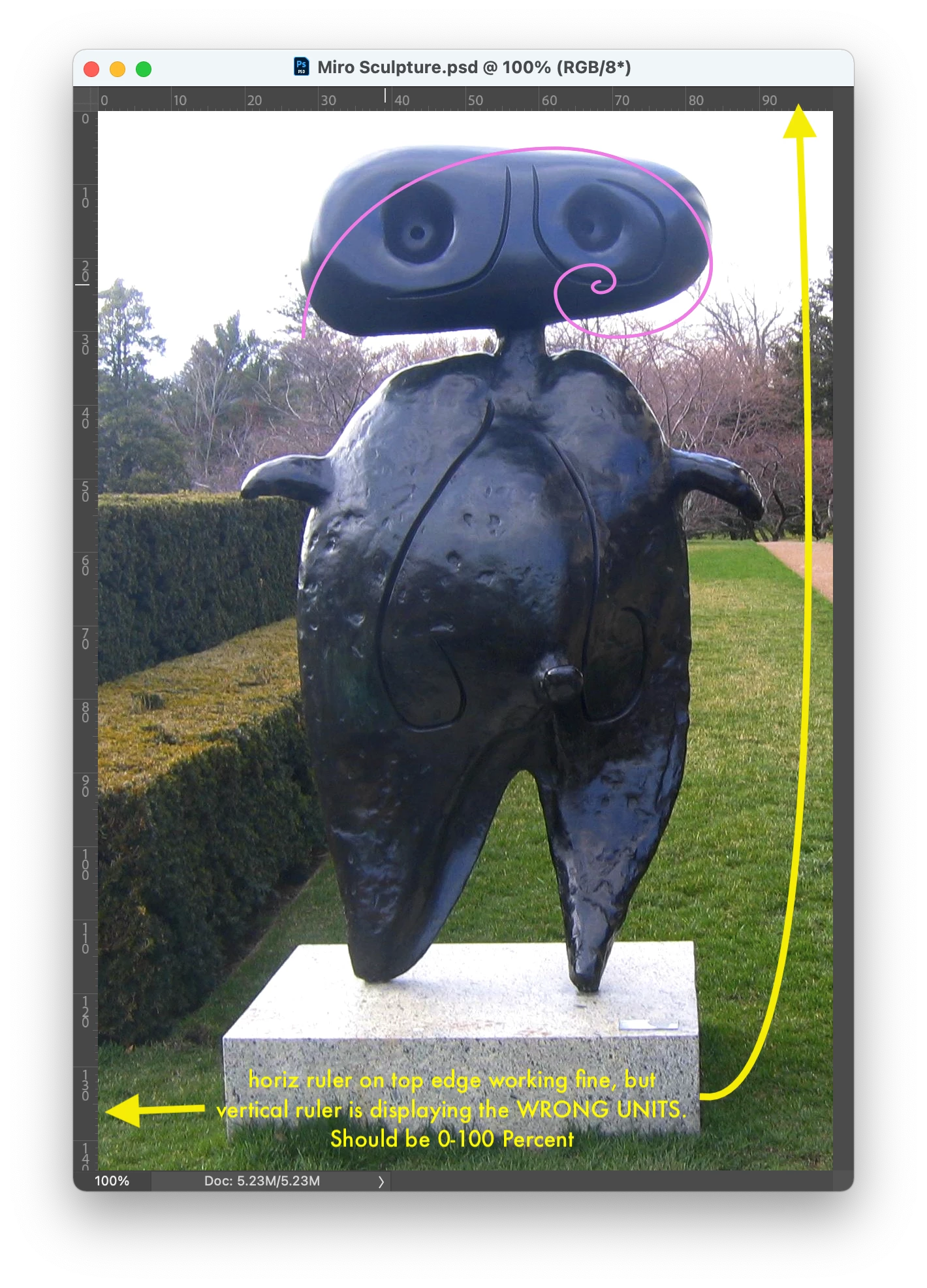 When changing the Ruler units to Percent, the wrong units display on the vertical/left ruler. The horizontal/top ruler works normally, and other units (Pixels, Inches, Cm, etc.) seem to work normally.
