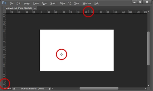 Photoshop CC 2015.0.1 - With the rulers visible, normally the movement of the cursor on the canvas is followed by some thin dotted lines (one on the vertical ruler, other on the horizontal ruler) that move along the horizontal and vertical rulers providing you with some orientation of where you are in the canvas (even if no "real" guide has been placed.