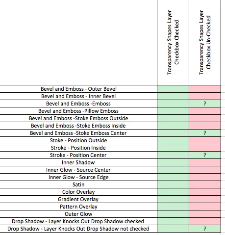 Here is a table indicating where I have been able to create incorrect formation of Layer Styles (marked by Red) so far.