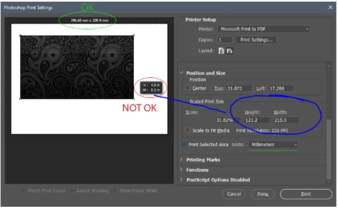 But in Print Dialog I have one bug. I select Unit: Millimeters in Position and Size and...