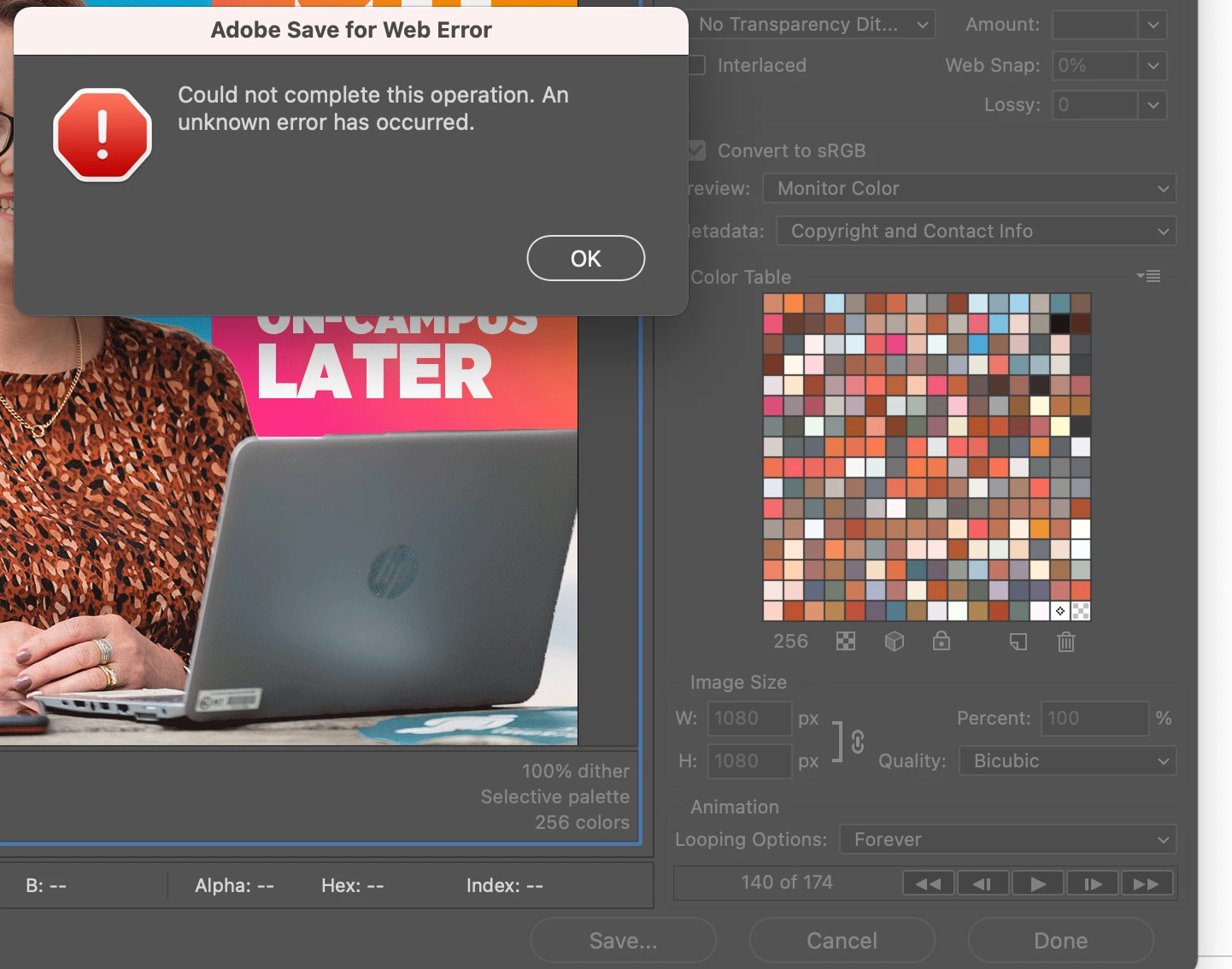 I'm trying to make a .gif from video frames.  I used the import video frames function to load the frames into the PS interface, then the save for web (legacy) export option.  I get this error whenever I attempt to either preview or save.  I've tried the oldest & newest versions of PS available to me through AdobeCC.  I'm using the 128 Dithering preset, and the source clocks in at 478 frames.  The source file name, source folder, export file name, and destination folder are all alphanumerically titled.  I have clear preferences on exit checked, PS is set to utilize my 1080ti, and am running a i7 9700k with 16gb of ram at 3200mhz, so I don't think it is a hardware issue.
