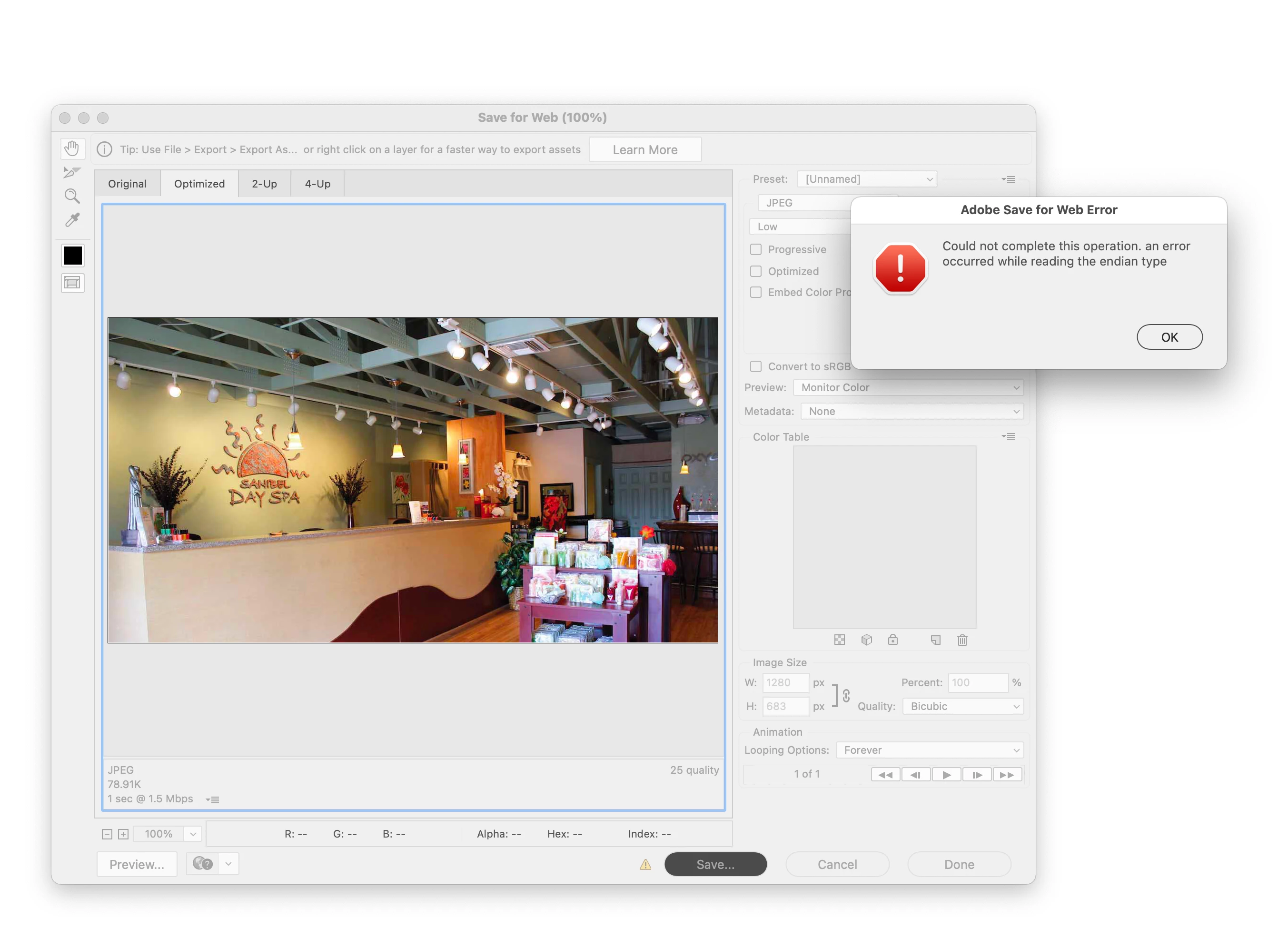 When you open a webp file and try to Export it with the "Save for Web (Legacy)" command, I get this error.