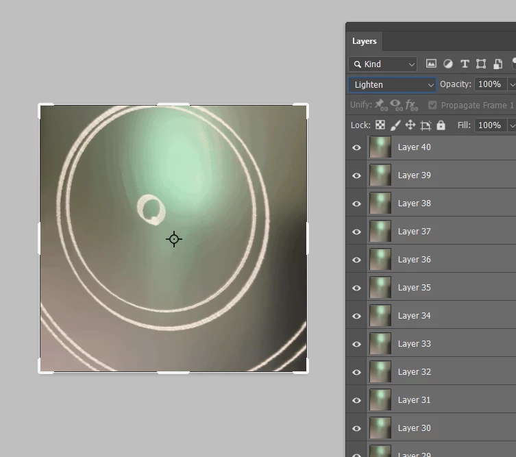 I've turned on all 40 layers here, and set them to Lighten and you can see there are only four steps in size for the ellipse.