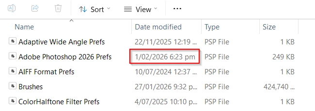 - If you see folders for older versions (e.g., Adobe Photoshop 2024, 2023), move them to your desktop or rename them.