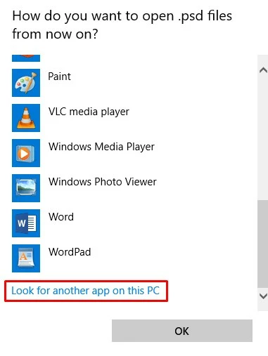 • Then click on More Apps.. on the bottom and scroll down, then click Look for another app on this pc.