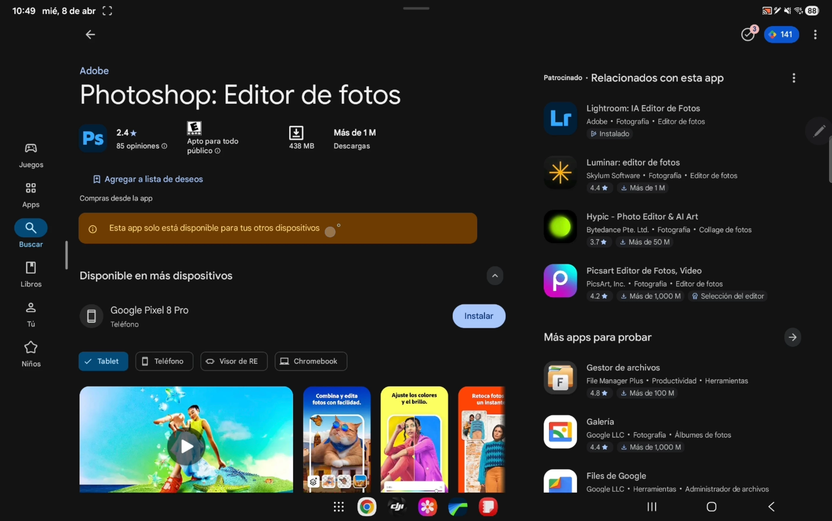 Tengo una Samsung Tab S10 plus y quiero descargar el photoshop en mi tablet pero me dice que no es compatible, aunque mi tablet este actualizada al android mas reciente no me deja descargarlo, si me deja en mi teléfono pixel pero quiero tenerlo en mi tablet para mejor comodidad