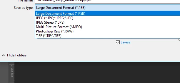 Other common reasons why a certain file format may not be available are file size, inappropriate colour mode, layers, channels or bit depth.
