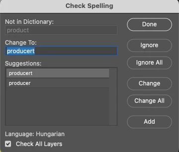 Photoshop Spell Check is set to wrong language