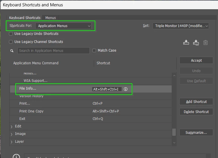 Scroll all the way down to File Infoand reinstate the shortcut.
