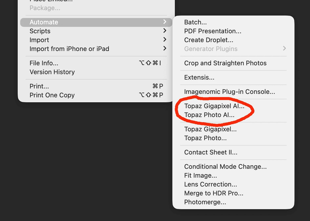 I have removed two Topaz Photoshop plug-ins from my computer in all the required places. The removed Plug-Ins still show up in the Automate Menu even though I believe I have trashed all related plug-in files. The file below shows the two plug-ins circled in red that remain. I have found no way to stop this from showing up. I have gone into the plug-ins folder and other Adobe preference files. This is happening on my Mac Studio and MacBook Pro with all updated system software. (Tahoe 26.0.1) Any advice would be helpful!