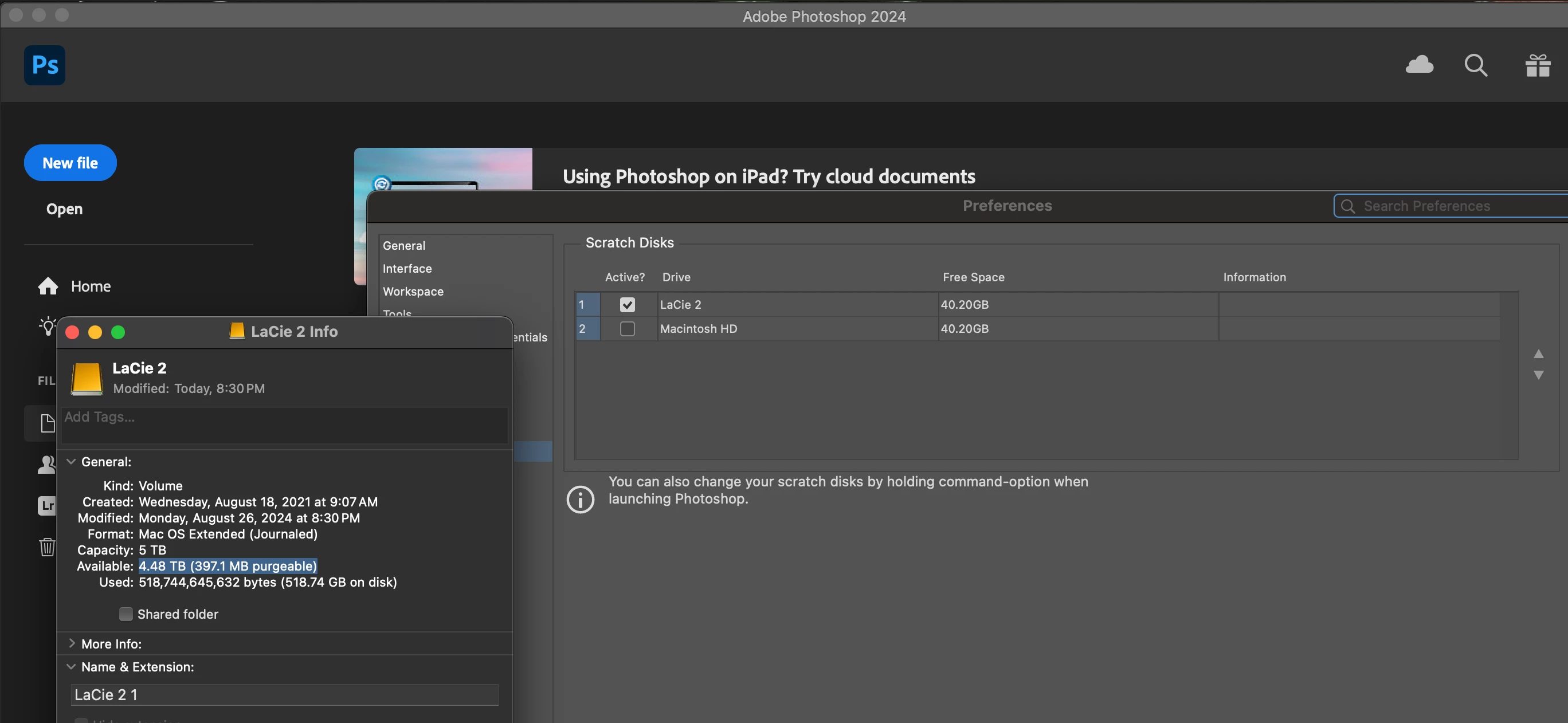 Photoshop says both my internal drive and my external drive have exactly the same amount of free space even though my External drive has significantly more free space. I have reformatted my external drive, reinstalled photoshop and gave everything full disk access. What could be wrong? Included screen showing how much space I have free on my external drive & how much photoshop is saying I have free which is wrong. Gosh i cant get a break with problems. Any suggestions?