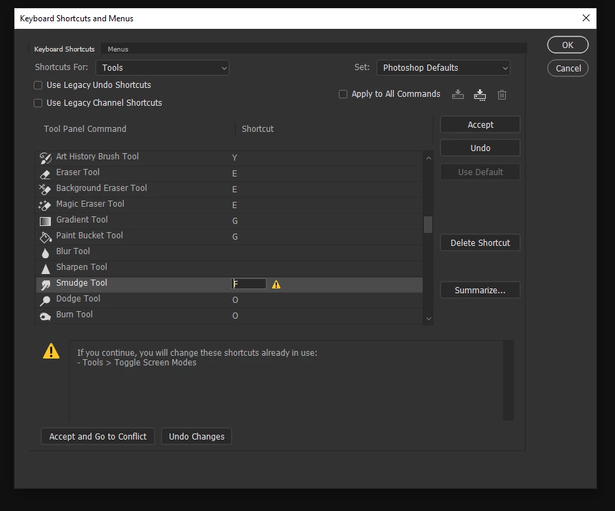 On the newer versions, I can't choose to apply this shortcut to it because it's by default on the Toggle Screen tool, that I'm already using with Tab.