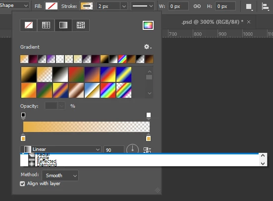 For me, the pulldown menu to select the gradient type of a stroke is hard to read, since all the entries seem to be bunched up in this menu. Tested with PS 25.11.0 on Windows 10.