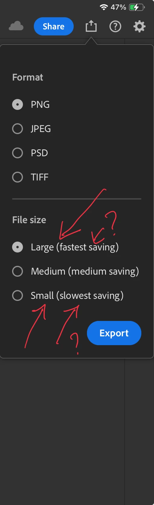 GGanesh38869395gqtjParticipantForum|Forum|1 year agoJuly 29, 2024The size vs speed - possibly wrong descriptionForum|Forum|1 year agoJuly 29, 20240 replies53 viewsJust noticed that the options provided in the iPad photoshop for exporting image to highest quality/filesize vs lowest file size the texts are showing fastest for large files and slowest for small file. Please correct 👍 iPadOS