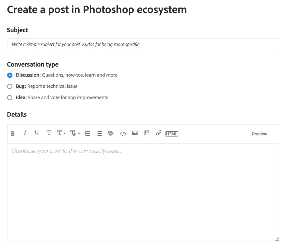 - Bug: This conversation type empowers you to be our helping hand and report software bugs to our product teams. However, there is a fine line between Discussion & Bug conversation types. A bug is an error, flaw, or fault in an application or system that causes it to produce an incorrect or unexpected result. If you experience this type of scenario, please report it! If you're unsure, then use the Discussion conversation type and work with the Adobe staff & ACP's to determine whether the problem you're seeing is a bug or a product issue that can be resolved by some troubleshooting.