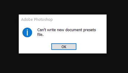Won't save as BMP then when closing Photoshop "Can't write new document presets file" box appears