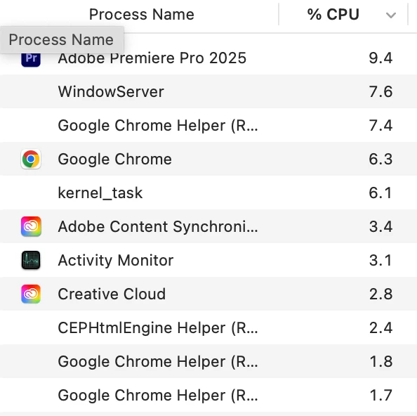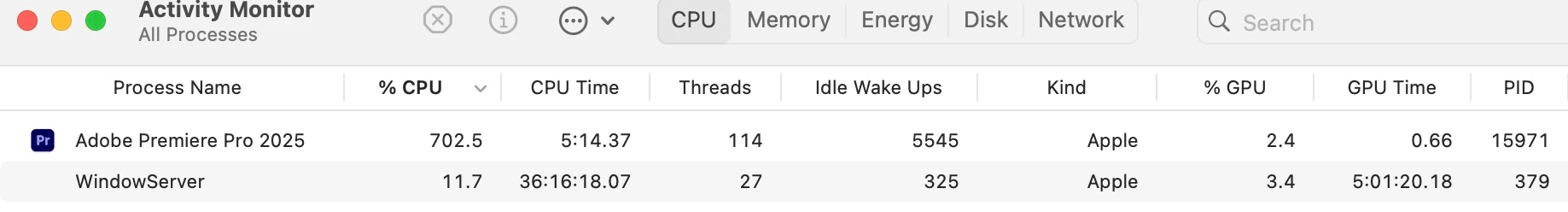 Adobe Premiere 25.2.1 on Macbook Pro using 700% of CPU even when idle
