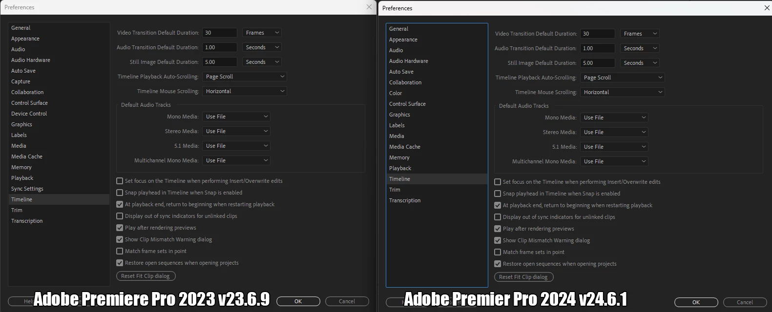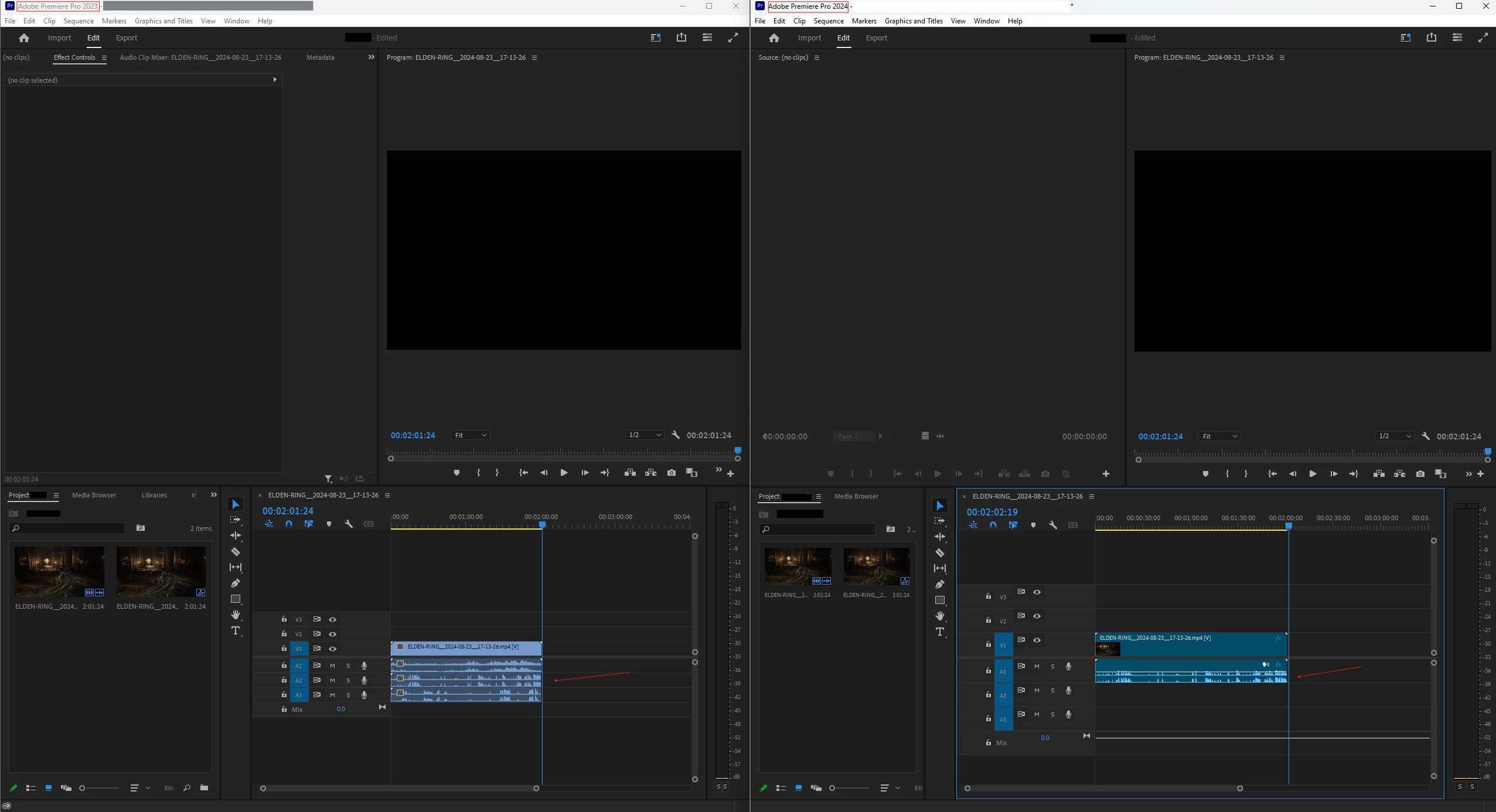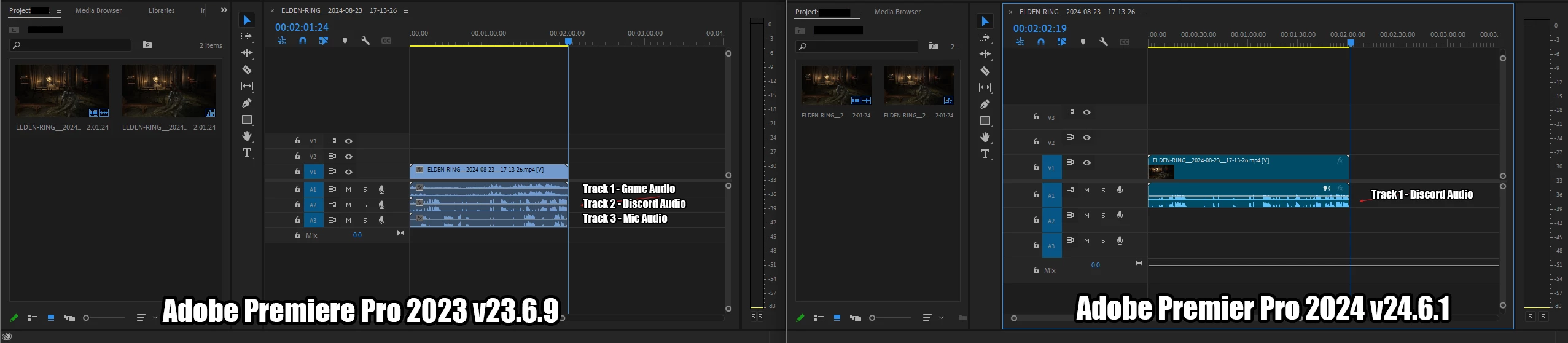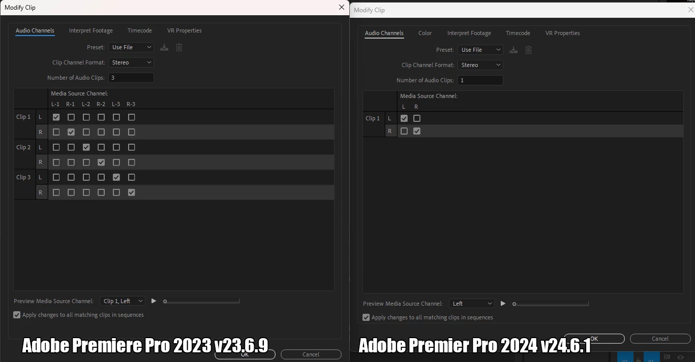 Attachment: Screenshot showing the difference between Adobe Premiere Pro 2023 and 2024 in handling multi-track audio.