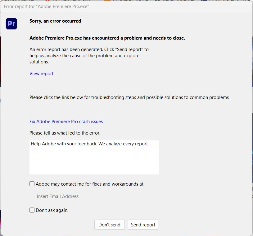 I’ve used Adobe Premiere Pro for about 12 years. I was given the above work laptop in Nov 2025. To be honest I haven’t used APP since then - until this week. I have literally just opened the software and created a new blank file. Absolutely nothing else. I’ve then gone to make a cup of coffee. When I’ve come back I’ve seen the attached error message on my screen.