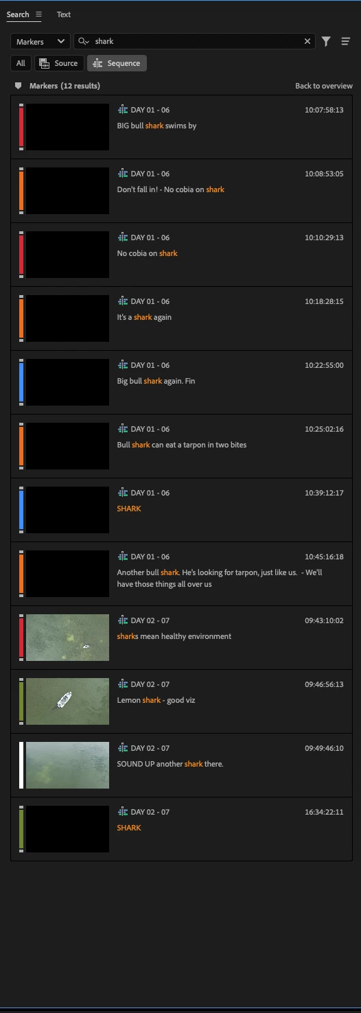 I believe I've found a bug in the new AI search panel, when filtering for markers. For context, in this project I work from daily string-out multicam timelines.