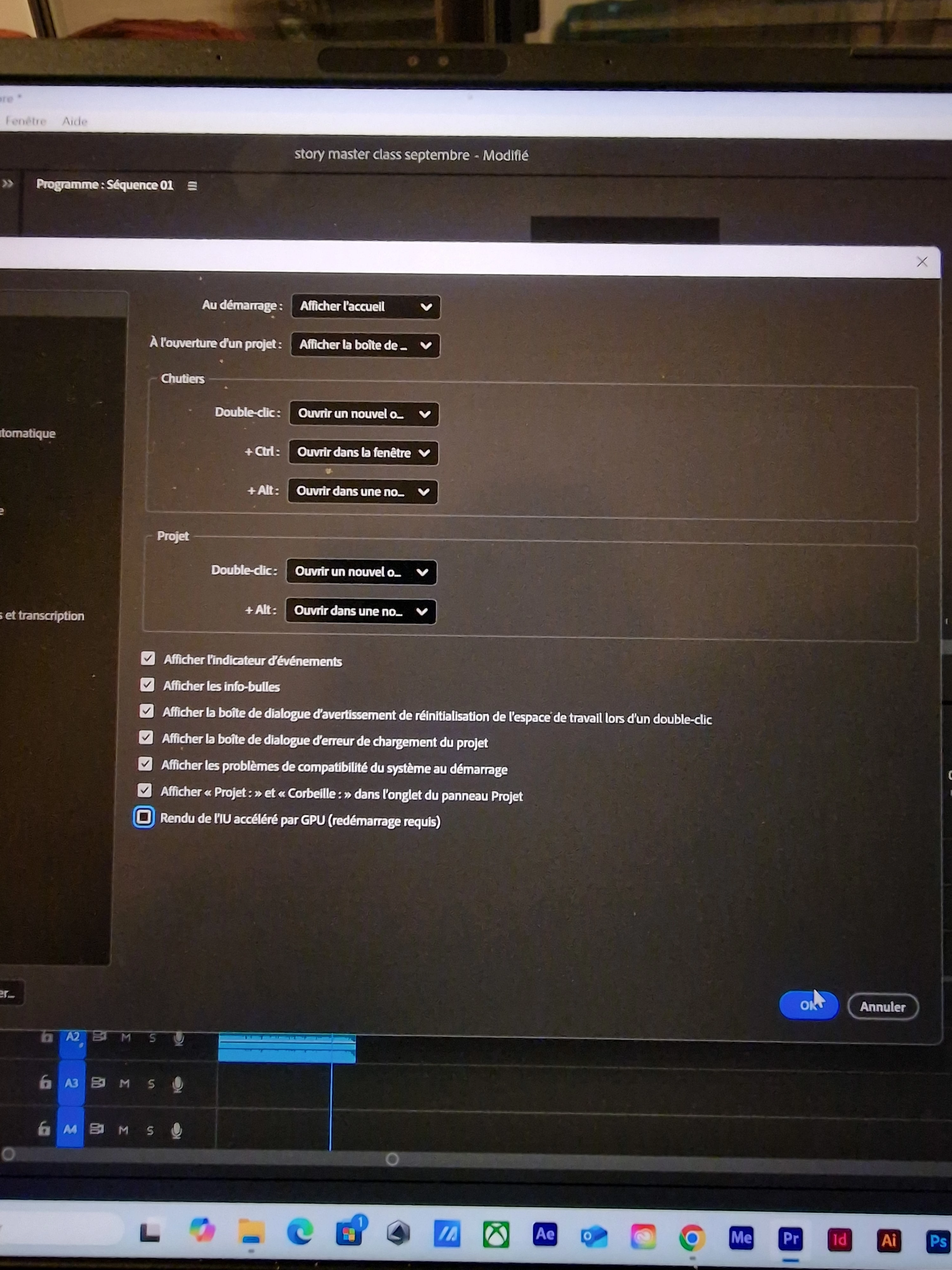 Quelqu'un peux m'aider, je ne peux plus utiliser premiere pro, j'ai téléchargé premiere pro sur mon nouveaux pc, j'ai commencer le montage, c'était parfait, et sans aucune raison, plus d'image dans la previsualisation, ecran noir et bug dans tous la timeline. Premiere pro crach, je ne peux rien faire.