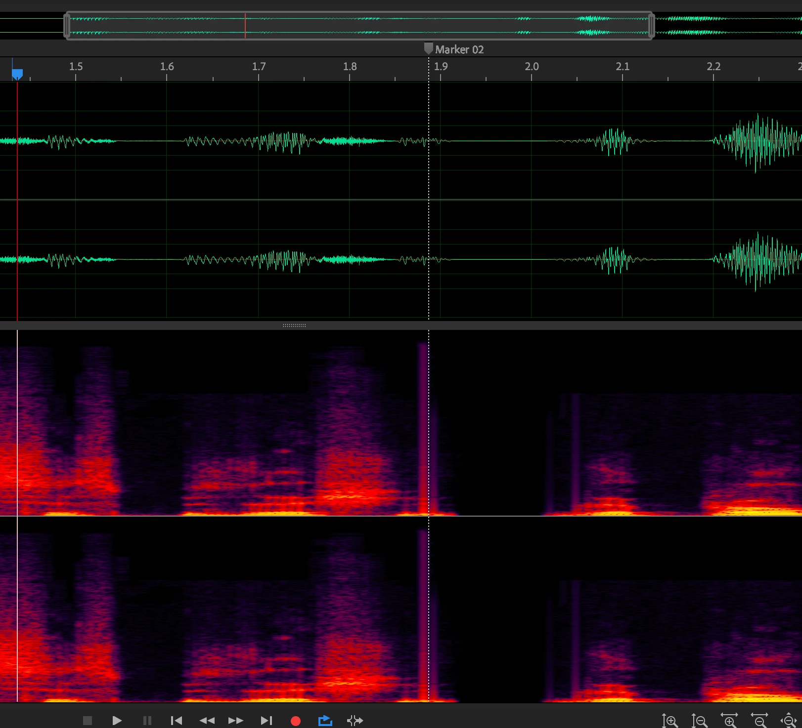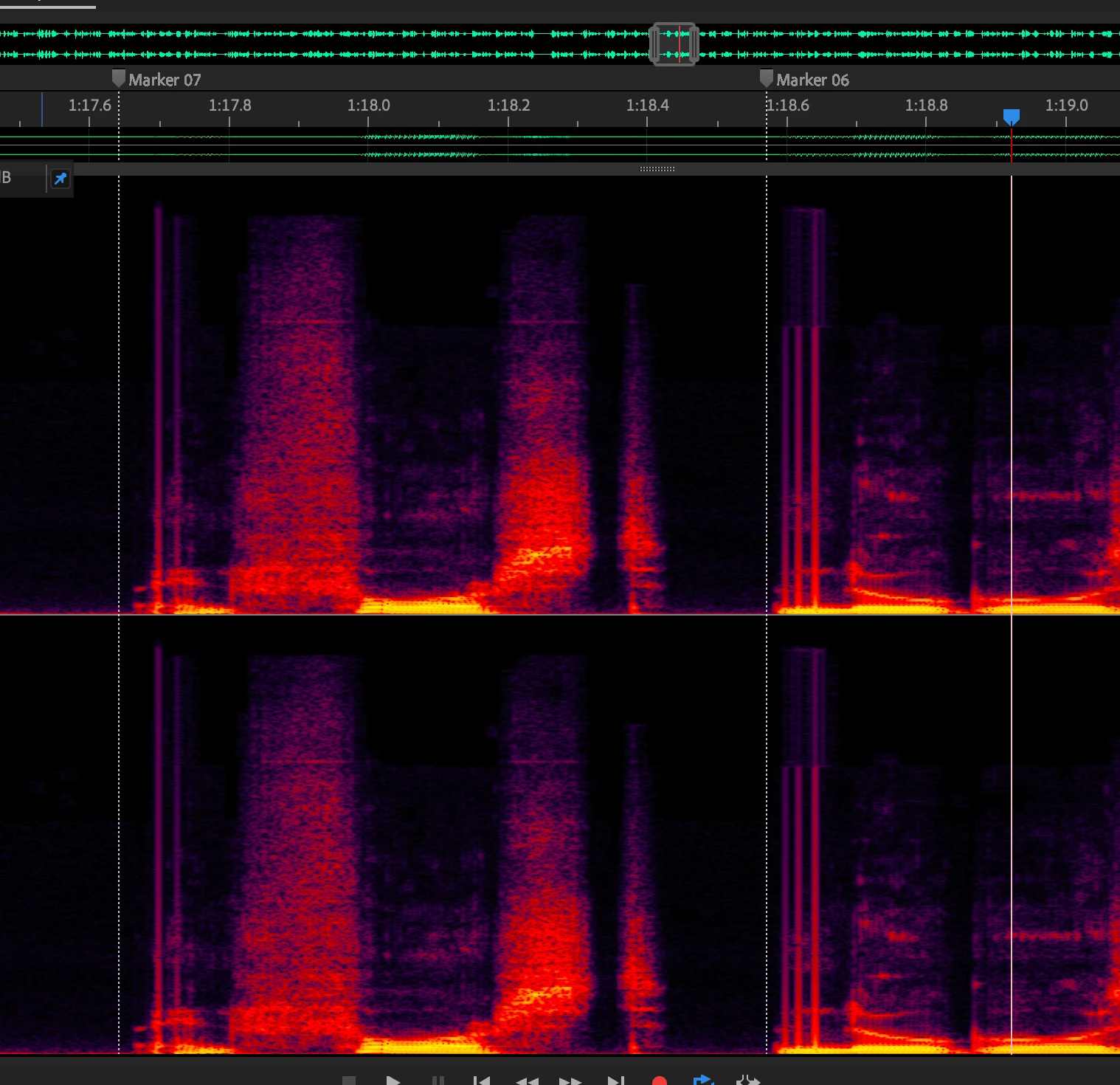 Here's a waveform and spectrum view of the exported audio from that section of the timeline. The glitch is the spot where the marker is --note how the whole spectrum lights up there. This full spectrum glitch is not in the original audio--only on the export.