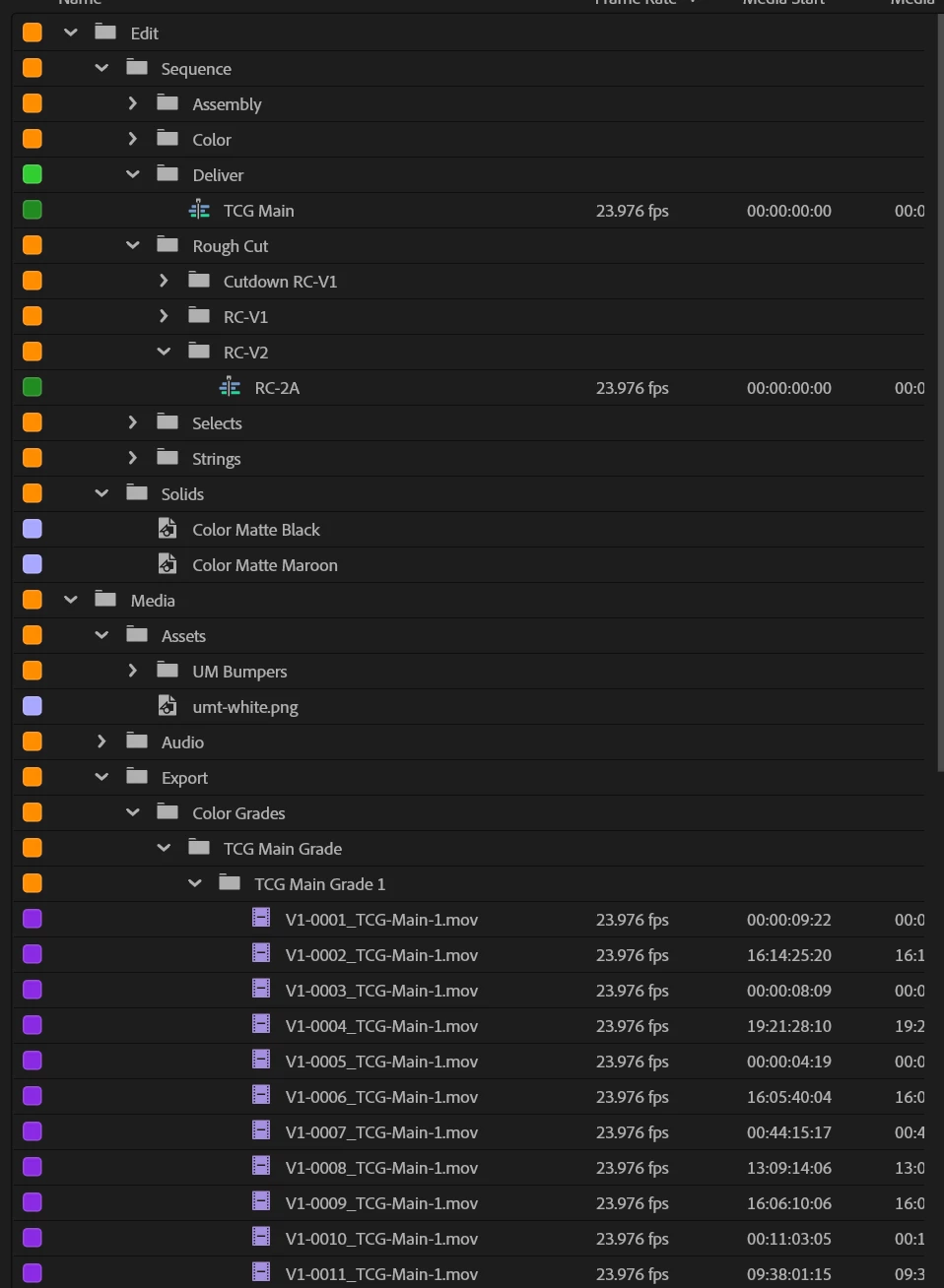 Premiere Pro does not reliably retain the expanded/collapsed state of bins (folders) in the Project panel when switching between workspaces, especially in the “Assembly” workspace with List View. This behavior is inconsistent and causes repeated friction when working with deeply nested project structures.