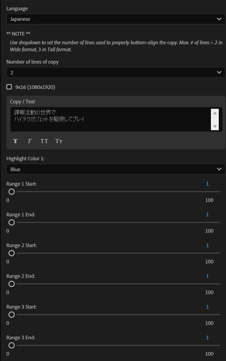• Duplicate the sequence to make the Japanese version for example. Toggle the language drop down in each mogrt to "Japanese", which under the hood loads up the proper font.