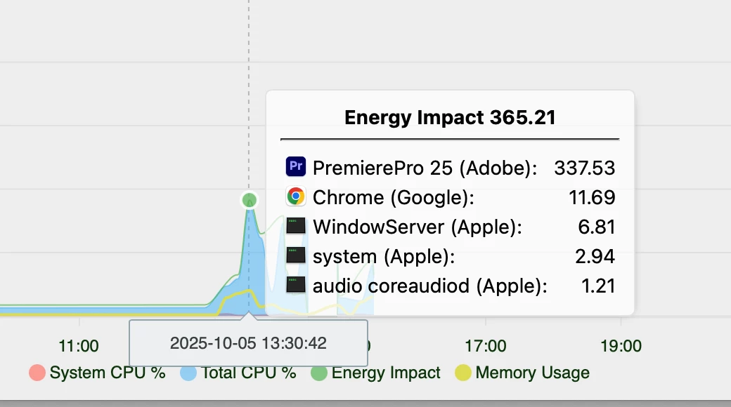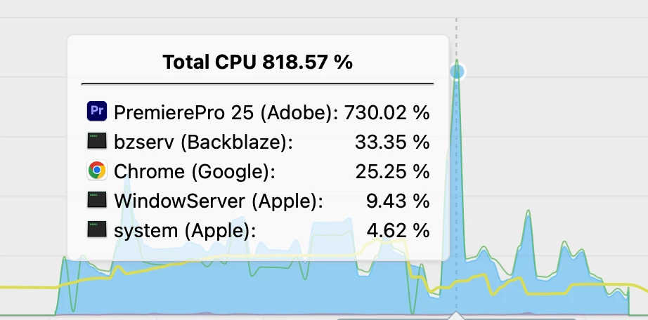 I'm having frequent CPU spikes (300% and higher) and crashes in v25.4.1 and have tried every troubleshooting method I know, with no success. Showing high CPU usage (132%) even when idle. Giant spikes are happening with single layer of HD H264 footage with no effects. None of this media or sequences ever gave me issues before and there is nothing new to explain what is triggering this. I've tried dumping cache files and prefs, disabling plug-ins and updating Premiere (I'm avoiding 25.5 at this point for various reasons).