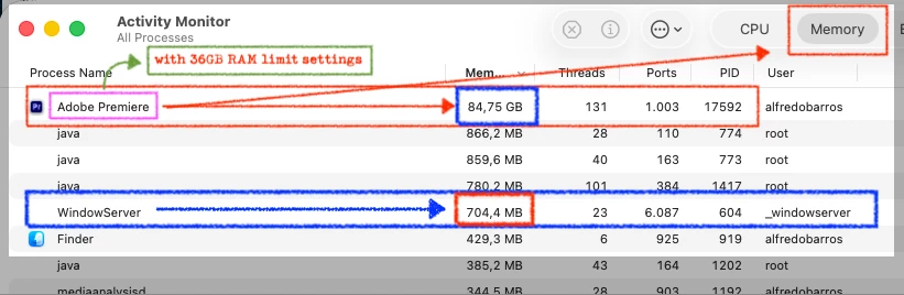 Memory Limiter: Setting the "RAM reserved for other applications" to a higher value (leaving only 24GB for Premiere) temporarily delays the crash by forcing more aggressive garbage collection, but it does not stop the leak.
