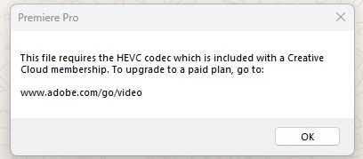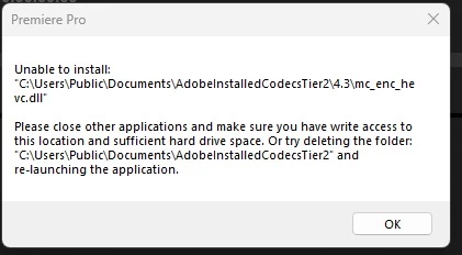 The exact error message from Premiere Pro