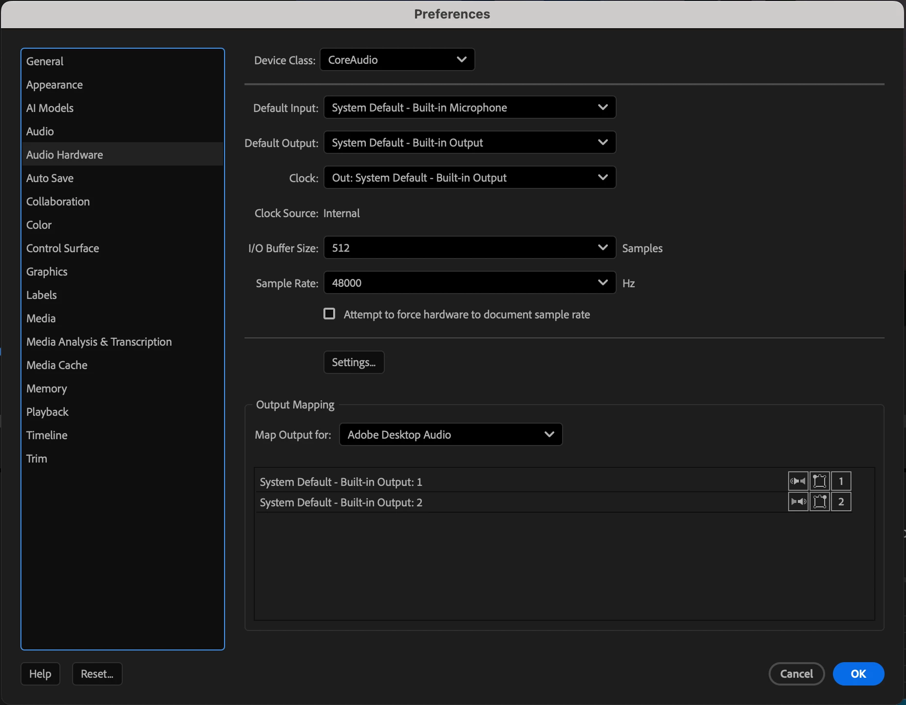 Then arose the second problem. All my footage timelines and line-ups that were made before premiere pro auto-upgraded in the Macbook Air are playing back properly, both video and audio. However, the newer edit timelines and selects timelines are not playing or allowing my to playback and/or edit. Meaning I am able to scrub, move frame by frame, copy-paste, insert-overwrite onto the timelines but have been unable to edit. It shows me the YELLOW ERROR CODE: 1609891835 - Premiere Pro could not start audio plaback. I went through the Community Forum again, deleted media cache files from Premiere Pro as well as the ~Library/Cache, reallocated the media cache location from my external edit drive to the internal SSD, etc. None of that worked. I was simply unable to playback. Then on another thread someone mentioned that I should select Adobe SRT in the Playback preferences. This allowed the playback of the video but audio is still not playing and I continue to get the error message as mentioned in the subject. I tried out different codecs in the Sequence Settings - Apple Prores Proxy, LT, H.264, etc. None of these steps have solved my problem.