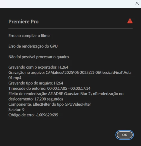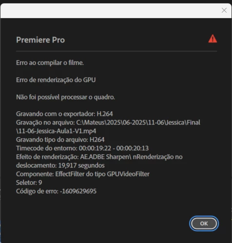 Estou enfrentando um problema recorrente com meu projeto de vídeo. Erros aparecem continuamente, impedindo a renderização completa do vídeo. Além disso, por vezes, a tela do meu editor apaga e fica preta, forçando-me a fechar o projeto e reabri-lo. Cada vez que isso acontece, sou obrigado a refazer detalhes de texto ou imagem. O erro não está restrito a um segmento específico, como "19 segundos a 25 segundos", mas sim ocorre aleatoriamente ao longo de todo o vídeo. Neste projeto em particular, utilizei o plugin Mister Horse, e estou incerto se isso pode estar causando incompatibilidade com o Premiere. Deixei um print com o código do erro para auxiliar na identificação do problema. Gostaria de receber sugestões de como posso solucionar esse problema.
