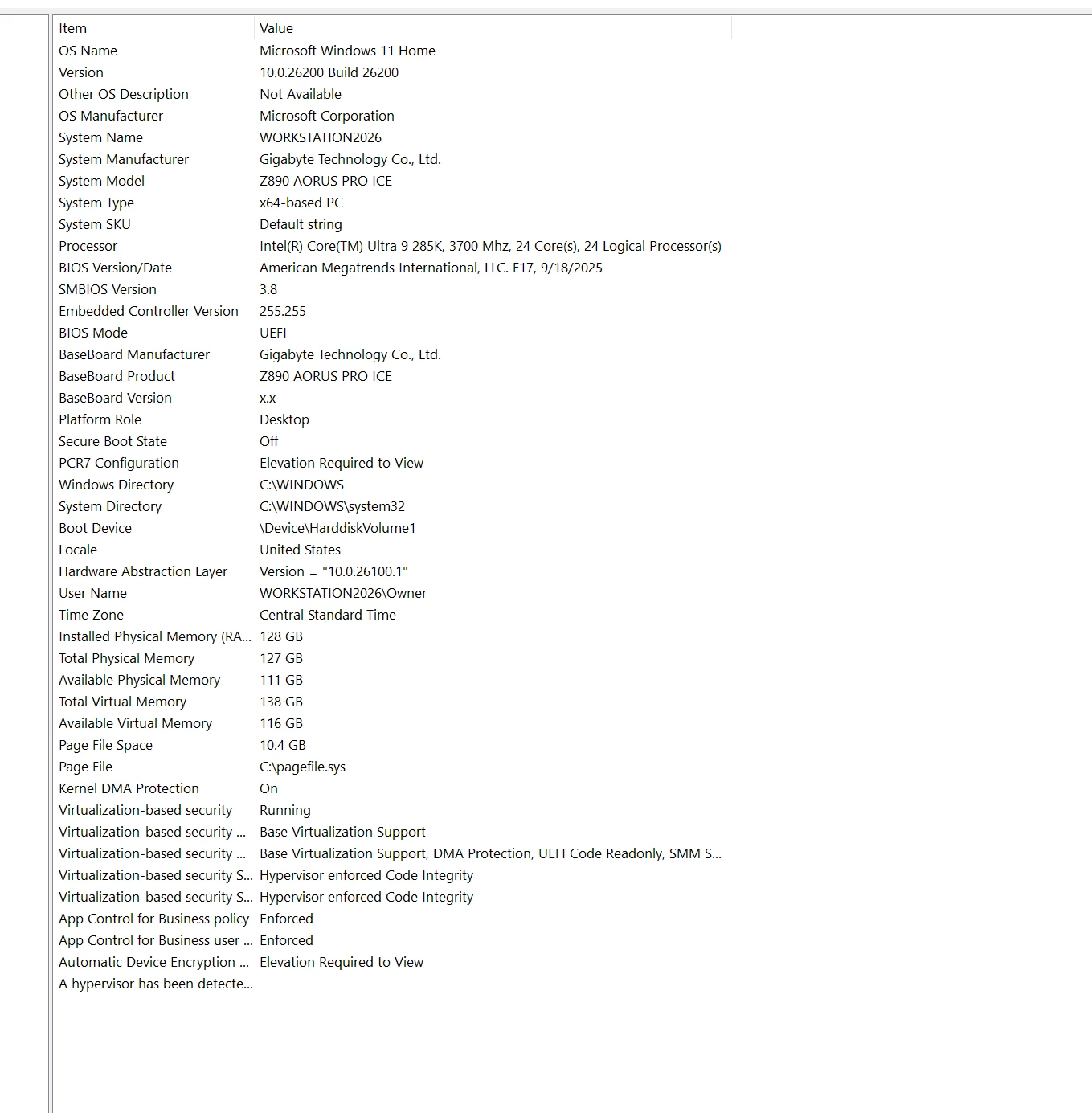 Running on a windows with a Intel Core Ultra 9 and GeForce RTX 5080 and a z890 Aorus Pro Ice Motherboard.