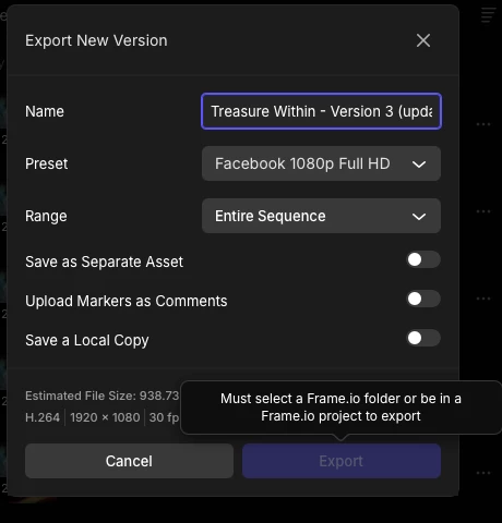 This blocks normal versioned exports and causes confusion, especially for editors managing high-volume client revisions through Frame.io.