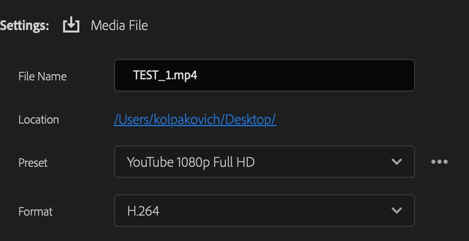 Then I try to render it. Premiere shows export dialog and filename is TEST_1.mp4: