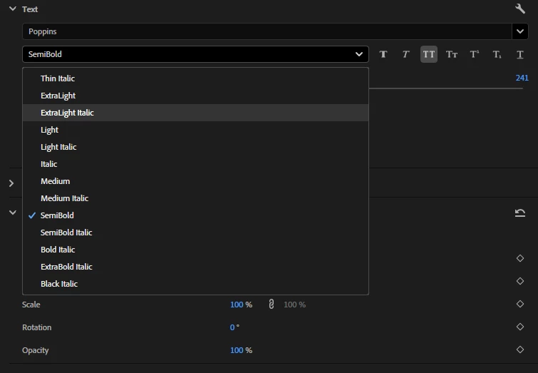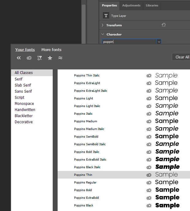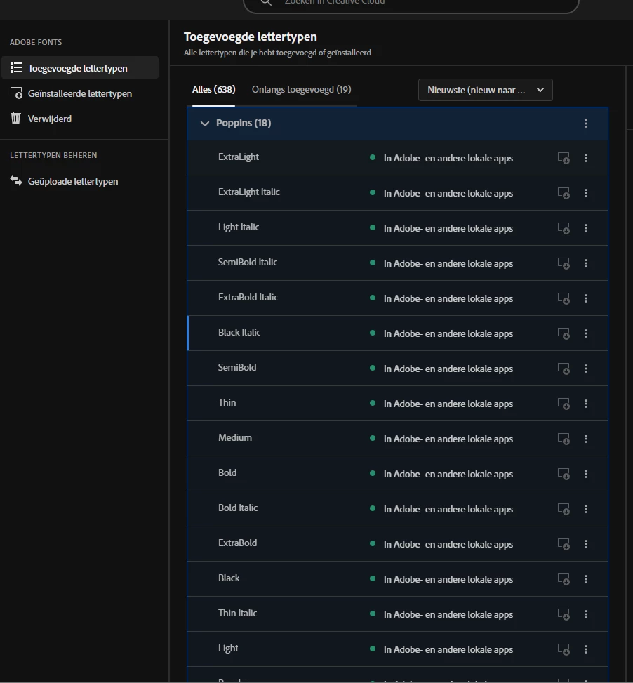 In Adobe CC app I installed the Poppins font family (18 fonts). Also set it to be available for other apps. All my apps on my computer (Adobe ánd non-Adobe apps) see all 18 Poppins fonts. Except Premiere Pro (25.5.0 (Build 13)): 5 of the 18 fonts just dont want to show up in the Font Style list.