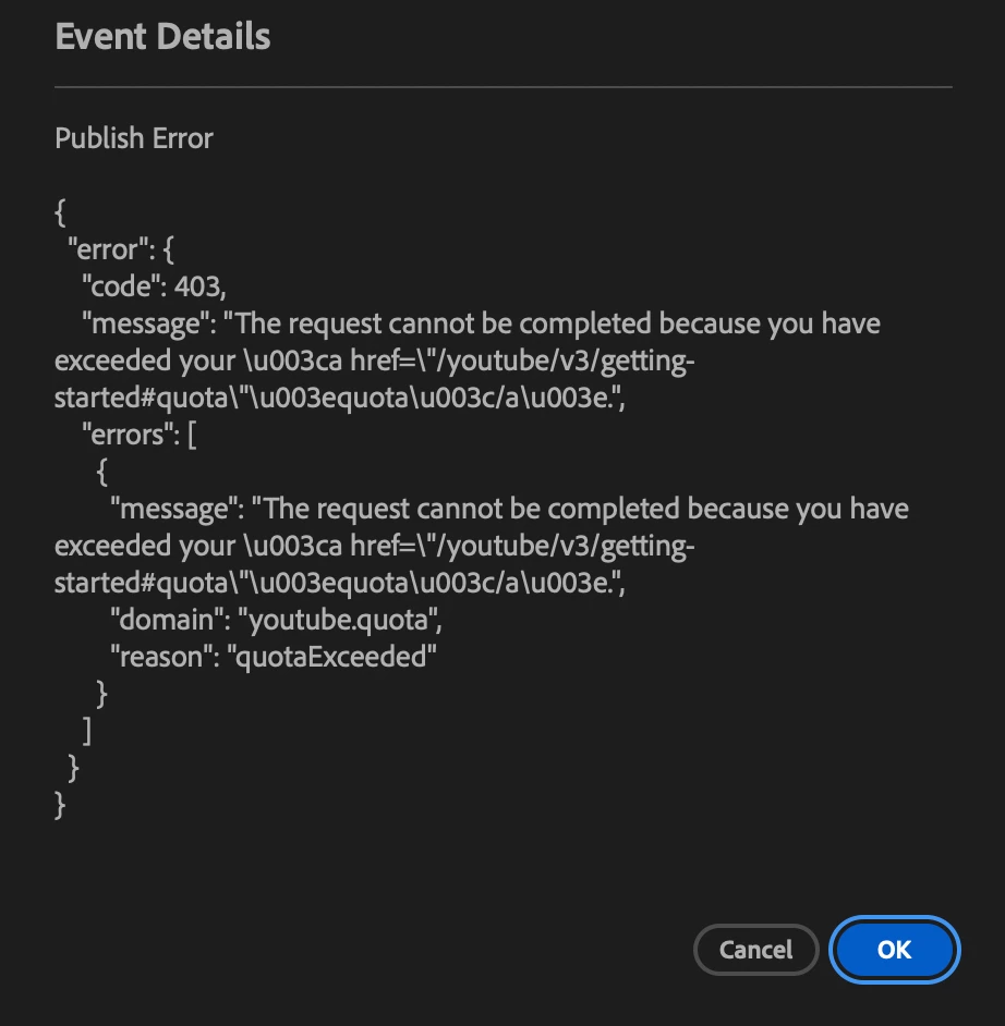When trying to publish video to YouTube, I get an error. AI is stating that this is an Adobe issue with their API. How/when can this be fixed?
