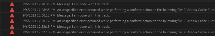 Tried importing a music track that was succesfully used in previous projects. However this time I get the cryptic error message: "I am done with this track." followed by an unspecified error message pointing to the cache file in question.