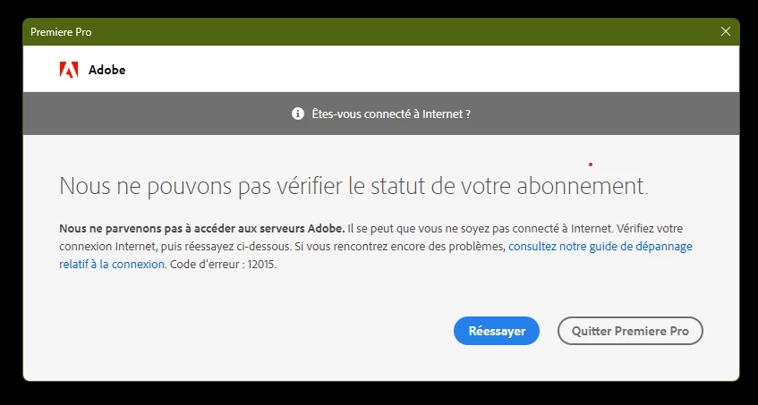 Je me suis lancée et aie pris un abonnement à la suite Creative Cloud, pour pouvoir accéder à toutes les applications Adobe. J'installe Premiere Pro et After Effect, les applications qui m'intéressent le plus, et lorsque je les ouvre, impossible de les utiliser car un pop-up m'indique que "connexion aux serveurs adobe impossible, nous ne parvenons pas à vérifier le statut de votre abonnement"