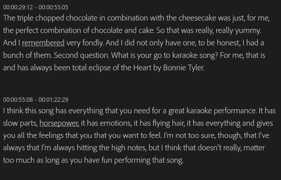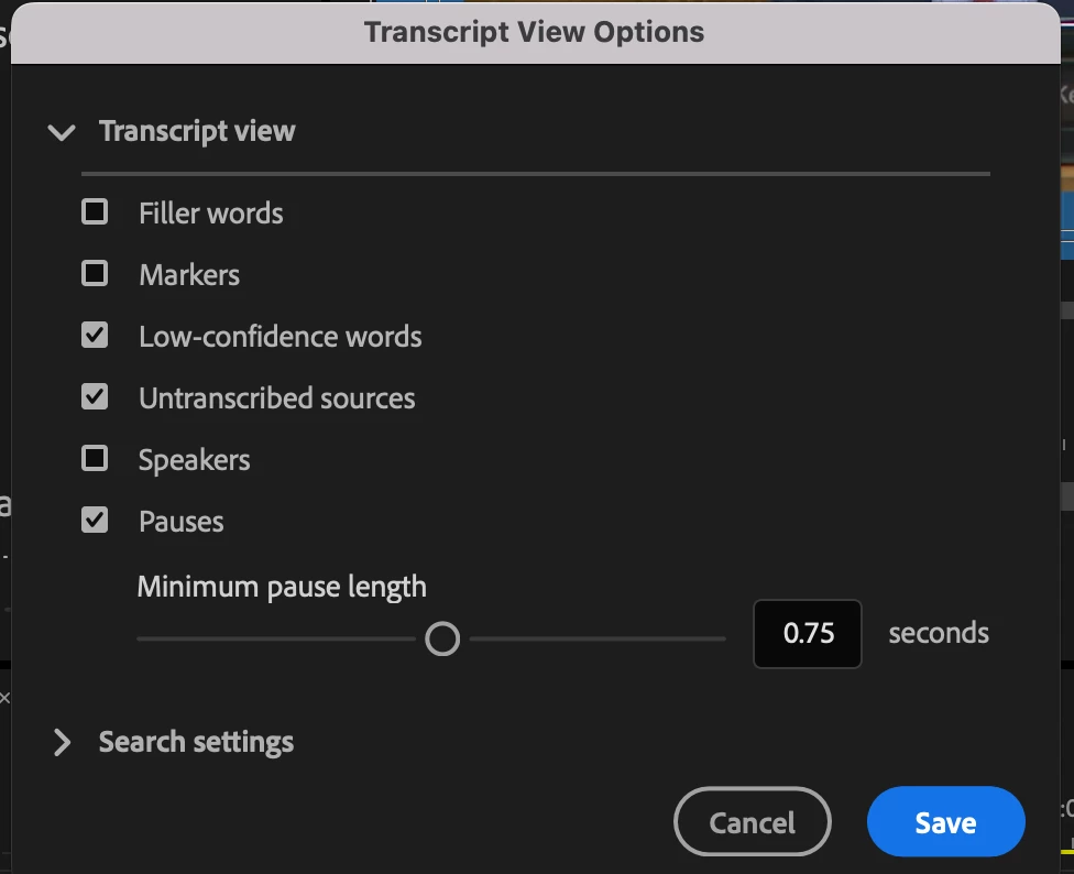 In Text panel settings, you can and toggle on/off the "Low-confidence words," which will underline words that the transciption is not so sure about, and makes it really easy to clean up the transcript. Right now, toggling them on/off doesn't do anything. I'm not able to see any underlines, and believe me, this audio should have a lot of low-confidence words underlined. Here is the settings panel: