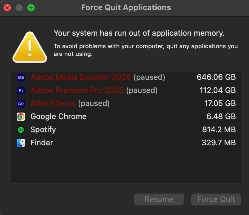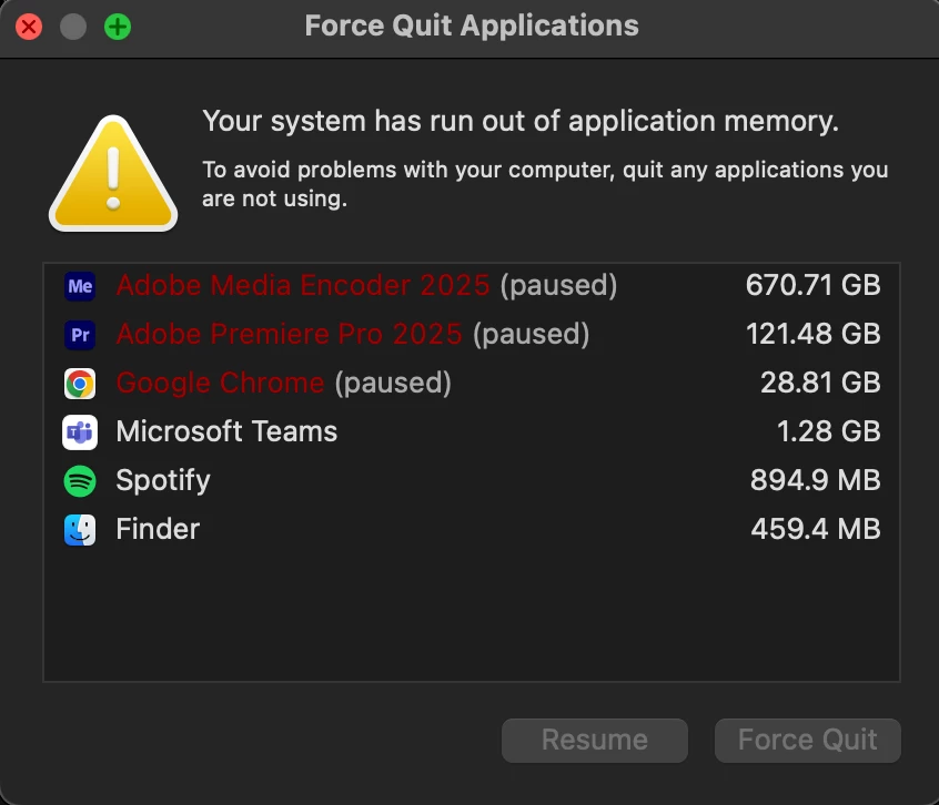 Here is my issue: I have (or I should say my company bought for me to use) a brand spanking new fully-loaded Apple Mac Studio 2025 with 256GB of RAM and a shiny new M3 Ultra chip, and it is really a great computer. However!-- even though it *usually* cuts through anything (even 6K footage) like butter, unfortunately I have had numerous "memory leaks" upon rendering, even the simplest projects/sequences, and while this has occurred mostly via Media Encoder, this issue has also manifest during renders via PPro as well, so I am listing this issue here to start. The strangest thing to me is how truly MASSIVE the 'leak' is!-- even though my system has a total 256 GB of RAM, my Activity Monitor states a MUCH higher usage amount-- the highest I have seen it go to is 670.71GB, which again is SUPER strange because I only have 256GB to begin with! Not sure how this is even possible, to be honest...