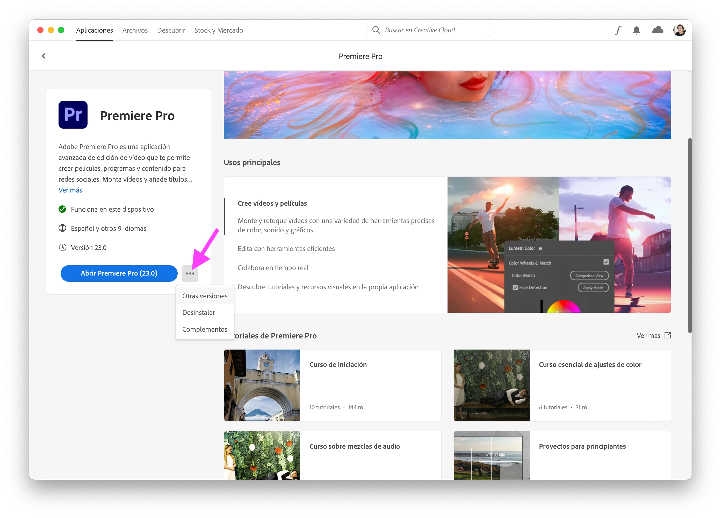 In the Creative Cloud desktop application click on the video tab and in Premiere Pro click on "More info" and this window appears, click on the three dots again and choose "Other versions" so you can install the version again 2022, at least until you can work properly on 2023 (screenshot). Before you do that, you could try going into Project Settings and changing the Renderer in the General tab.