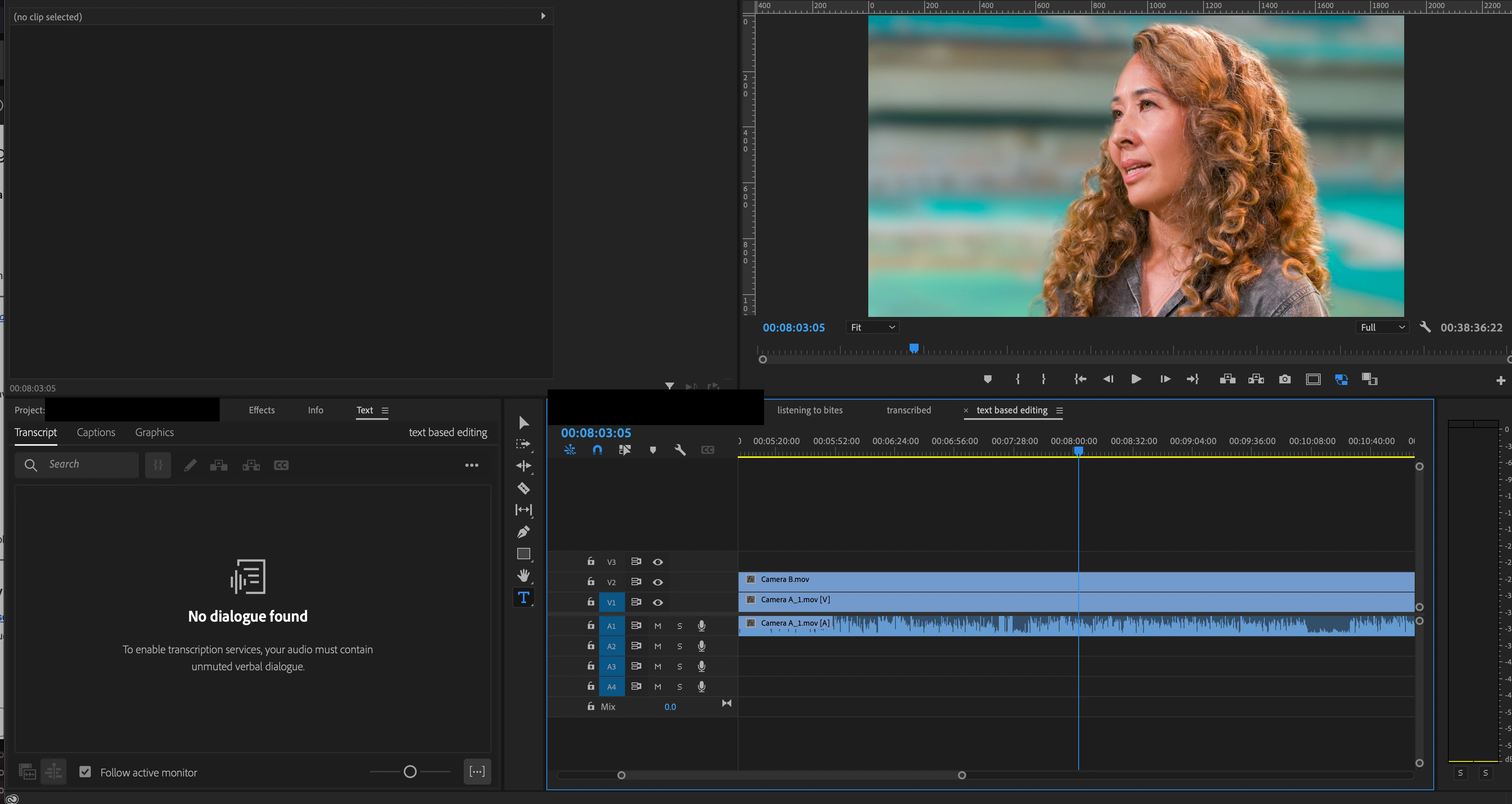 i clicked create static transcript and it transcribed it in 2 minutes. then i pressed some button "generate text based editing transcript" and went back to "no dialogue found"