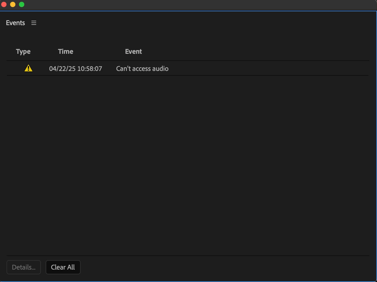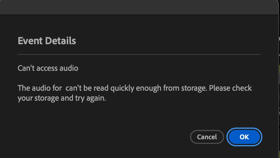 Just started getting this error window today while working on a very simple project that only has a couple After Effects motion graphics clips, and three tracks of audio: VO, music, and light SFX: