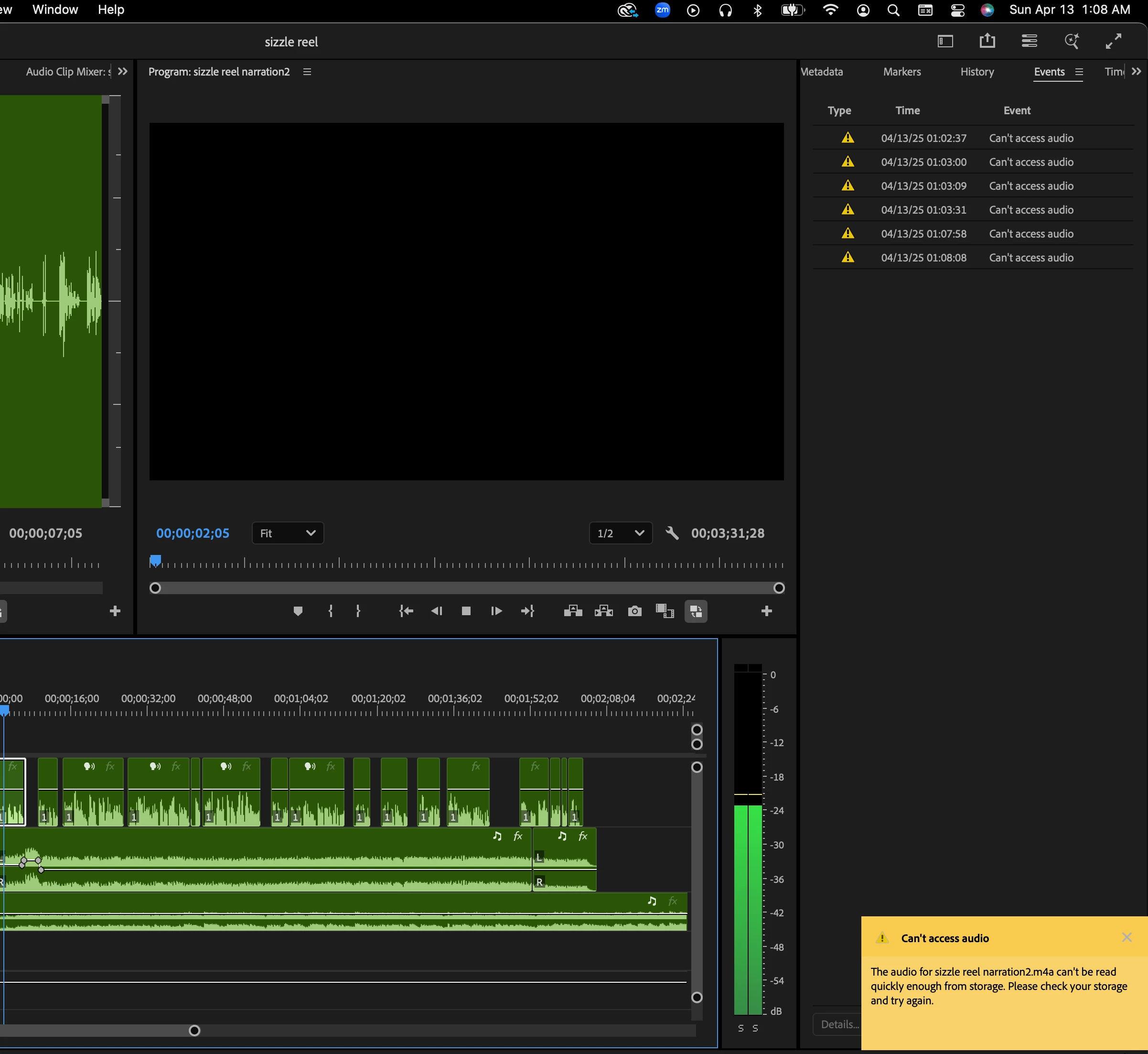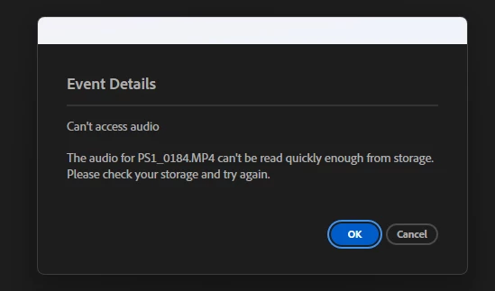 Just started getting this error window today while working on a very simple project that only has a couple After Effects motion graphics clips, and three tracks of audio: VO, music, and light SFX:
